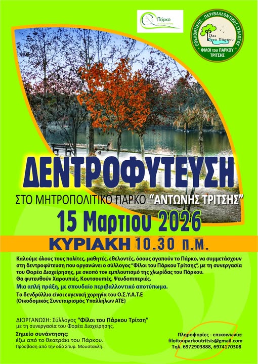 Καλούμε όλους τους πολίτες, μαθητές, εθελοντές, όσους αγαπούν το Πάρκο, να συμμετάσχουν στη δεντροφύτευση που οργανώνει ο σύλλογος "Φίλοι του Πάρκου Τρίτσης", με τη συνεργασία του Φορέα Διαχείρησης, με σκοπό τον εμπλουτισμό της χλωρίδας Πάρκου.