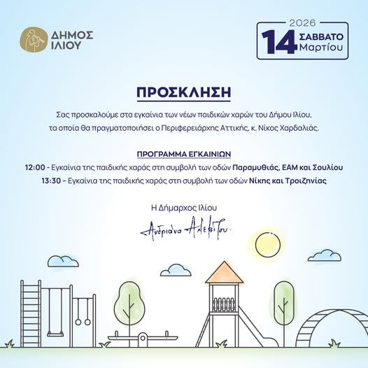Σας προσκαλούμε στα εγκαίνια των νέων παιδικών χαρών του Δήμου Ιλίου, τα οποία θα πραγματοποιήσει ο Περιφερειάρχης Αττικής, κ. Νίκος Χαρδαλιάς.