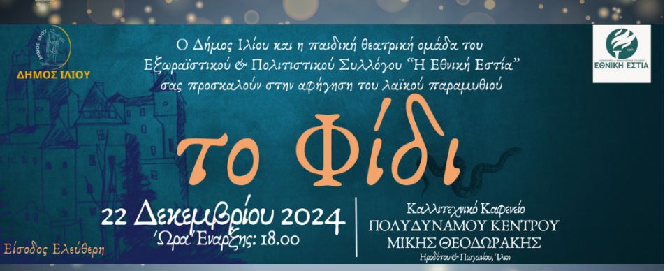 Το παιδικό θεατρικό εργαστήρι του Εξωραϊστικού και Εκπολιτιστικού Συλλόγου «Εθνική Εστία» παρουσιάζει το λαϊκό παραμύθι «Το Φίδι»,
