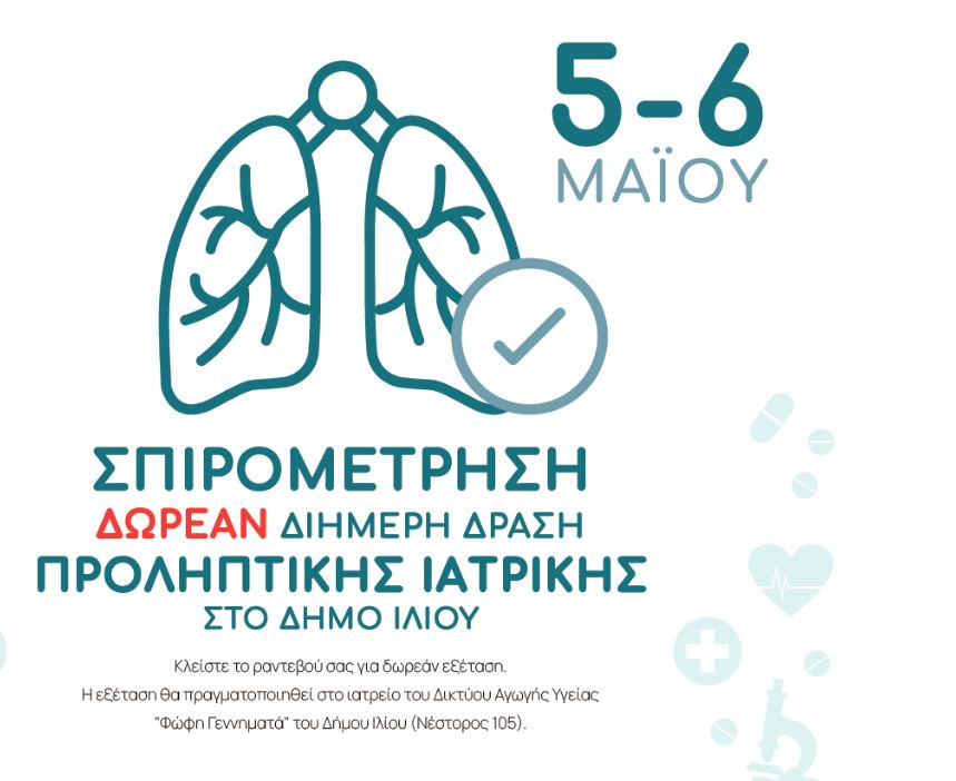 Ο Δήμος Ιλίου διοργανώνει ΔΩΡΕΑΝ ΔΙΗΜΕΡΗ ΔΡΑΣΗ προληπτικής εξέτασης σπιρομέτρησης στις 5 & 6 Μαΐου 2025.