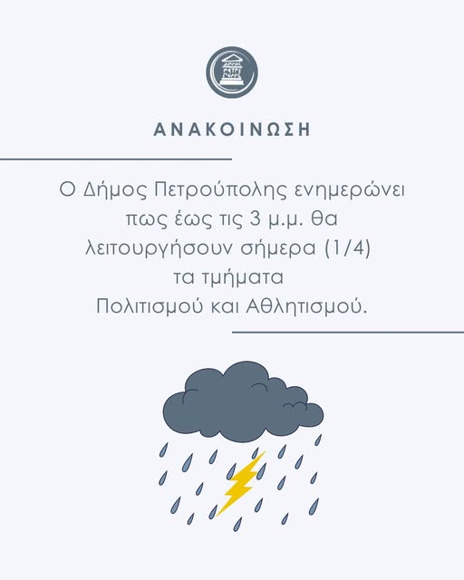 Ο Δήμος Πετρούπολης ενημερώνει ότι -λόγω της κακοκαιρίας «Erminio», η ένταση της οποίας βάσει των προβλέψεων της Ε.Μ.Υ., θα αυξηθεί από τις μεσημεριανές ώρες- οι δομές Πολιτισμού και Αθλητισμού, για λόγους ασφάλειας, θα σταματήσουν σήμερα (1/4) τη λειτουργία τους στις 15:00.