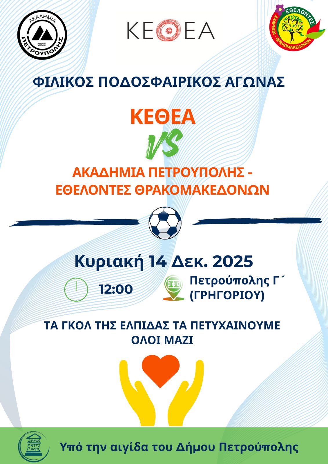 Την Κυριακή 14 Δεκεμβρίου 2025, στις 12:00 στο Γ' γήπεδο Πετρούπολης (Αγ. Τριάδα), θα πραγματοποιηθεί φιλικός αγώνας ποδοσφαίρου ανάμεσα σε αντιπροσωπευτική ομάδα του ΚΕΘΕΑ και μικτή ομάδα γονέων/προπονητών από την Ακαδημία Πετρούπολης και τους Εθελοντές Αχαρνών-Θρακομακεδόνων.