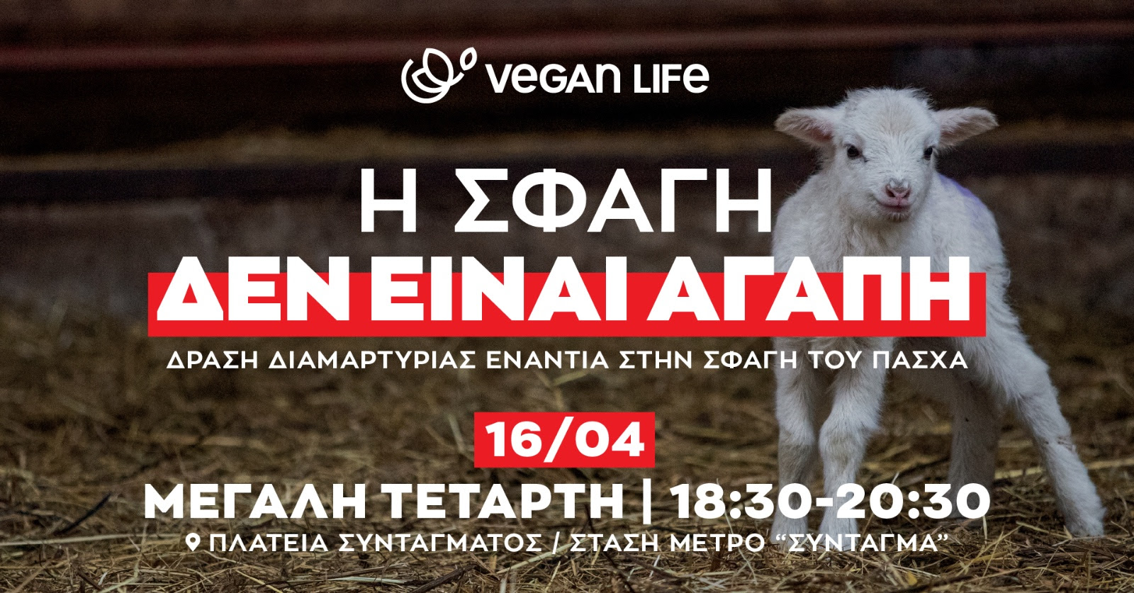Κάθε χρόνο στην μόνο για την Κυριακή του Πάσχα σφάζονται πάνω από 2 εκατομμύρια αρνιά και κατσίκια προκειμένου να καταναλωθούν Ελλάδα στο εορταστικό τραπέζι. Η Vegan Life καλεί για ακόμη μία χρονιά σε δράση διαμαρτυρίας και ευαισθητοποίησης με σύνθημα «η σφαγή δεν είναι αγάπη». Ήρθε η ώρα να γιορτάσουμε χωρίς θύματα. Μεγάλη Τετάρτη, 18:30, Πλατεία Συντάγματος. Φοράμε μαύρα. Τα πλακάτ δίνονται από την Οργάνωση. |