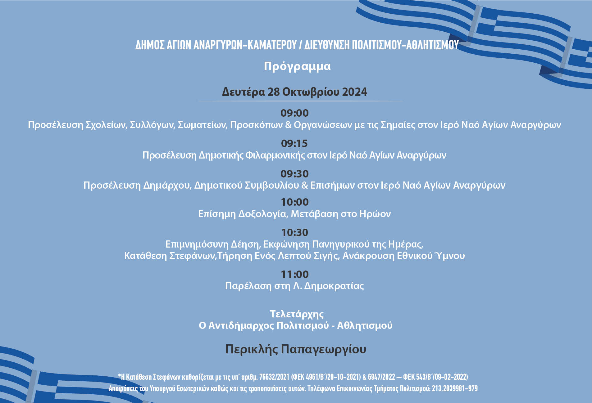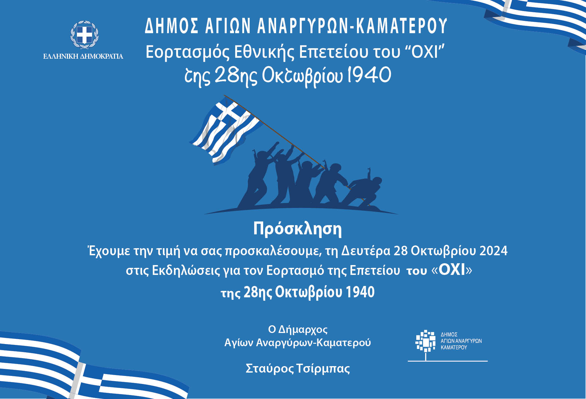 Η παρέλαση για την Εθνική Επέτειο της 28ης Οκτωβρίου θα διενεργηθεί στους Αγίους Αναργύρους τη Δευτέρα 28 Οκτωβρίου 2024.