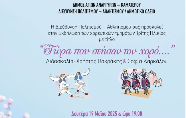 Την Δευτέρα 19 Μαΐου και ώρα 19:00 θα πραγματοποιηθεί η Εκδήλωση των χορευτικών τμημάτων Τρίτης Ηλικίας με τίτλο: «Τώρα που στήσαν τον χορό» στο Κέντρο Τέχνης & Πολιτισμού «Μαρία Έλενα» στην οδό Αγίας Παρασκευής 40 στους Αγίους Αναργύρους