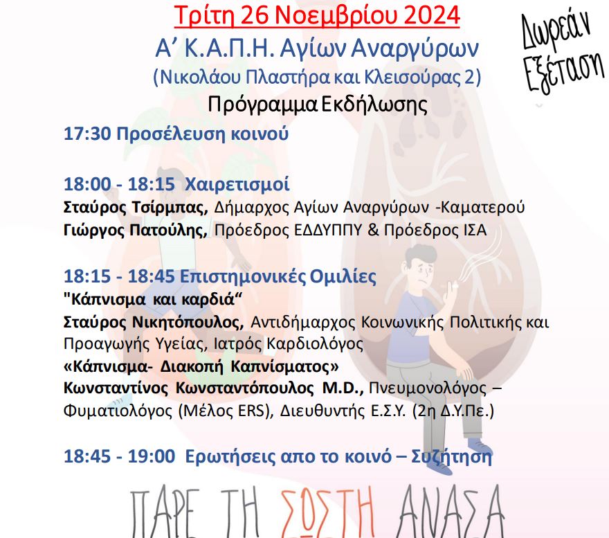 Ο Δήμος ενημερώνει τους δημότες ότι την Τρίτη 26 Νοεμβρίου και ώρα 17.30 θα πραγματοποιηθεί εκδήλωση ευαισθητοποίησης στο Δ' ΚΑΠΗ Αγίων Αναργύρων(Ανδρονίκου και Καζαντζάκη) με αφορμή την Ημέρα κατά του Καπνίσματος. Παρακάτω ακολουθεί αναλυτικά η αφίσα του προγράμματος καθώς και το αναλυτικό πρόγραμμα της εκδήλωσης.