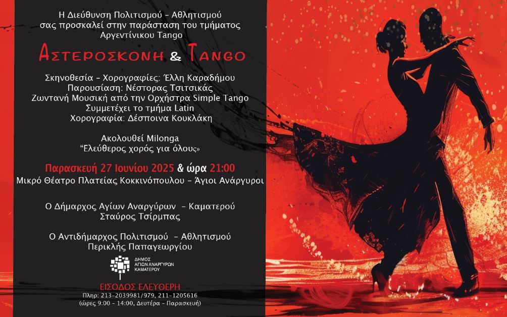 Η Διεύθυνση Πολιτισμού – Αθλητισμού σας προσκαλεί στην παράσταση του τμήματος Αργεντίνικου Tango "ΑΣΤΕΡΟΣΚΟΝΗ & TANGO" Σκηνοθεσία – Χορογραφίες: Έλλη Καραδήμου Παρουσίαση: Νέστορας Tσιτσικάς. Ζωντανή Μουσική από την Ορχήστρα Simple Tango. Συμμετέχει το τμήμα Latin .Χορογραφία: Δέσποινα Κουκλάκη