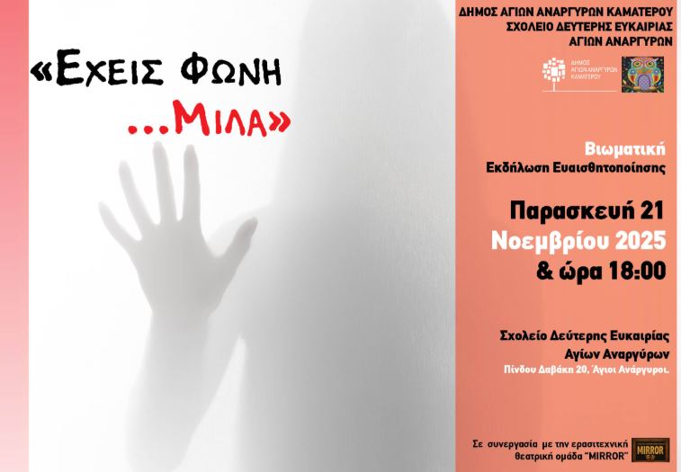 Την Παρασκευή 21 Νοεμβρίου και ώρα 18.00 θα πραγματοποιηθεί εκδήλωση ενημέρωσης και ευαισθητοποίησης με τίτλο: «έχεις φωνή, μίλα» με αφορμή την Παγκόσμια ημέρα εξάλειψης της βίας κατά των γυναικών. Η εκδήλωση θα διεξαχθεί στο Σχολείο Δεύτερης Ευκαιρίας (οδό Πίνδου Δαβάκη 20), στους Αγίους Αναργύρους.