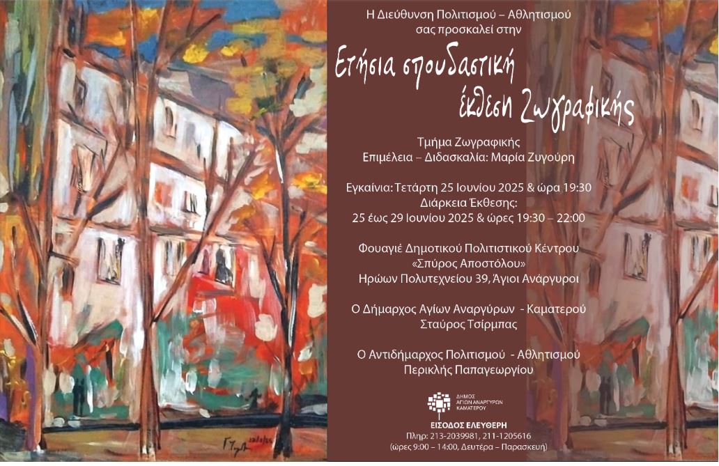 Επιμέλεια – Διδασκαλία: Μαρία Ζυγούρη .Εγκαίνια: Τετάρτη 25 Ιουνίου 2025 & ώρα 19:30. Διάρκεια Έκθεσης: 25 έως 29 Ιουνίου 2025 & ώρες 19:30 – 22:00 Φουαγιέ Δημοτικού Πολιτιστικού Κέντρου «Σπύρος Αποστόλου» Ηρώων Πολυτεχνείου 39, Άγιοι Ανάργυροι