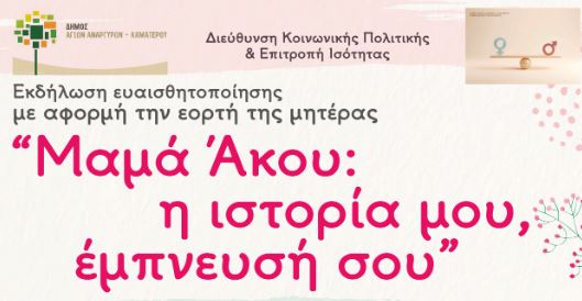 Την Κυριακή 11 Μαΐου και ώρα 19.00 στο Κέντρο Τέχνης και Πολιτισμού «Μαρία-Ελενα» θα πραγματοποιηθεί εκδήλωση ευαισθητοποίησης για τη γιορτή της μητέρας με τον τίτλο: «Μαμά άκου, η ιστορία μου, έμπνευσή σου».