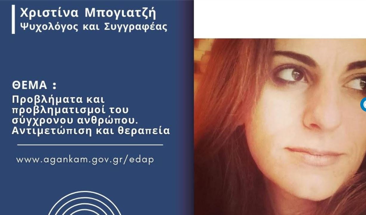 Εισηγήτρια θα είναι η κ. Χριστίνα Μπογιατζή, Ψυχολόγος και Συγγραφέας και το θέμα της εισήγησης το παρακάτω: «Προβλήματα και προβληματισμοί του σύγχρονου ανθρώπου. Αντιμετώπιση και θεραπεία».