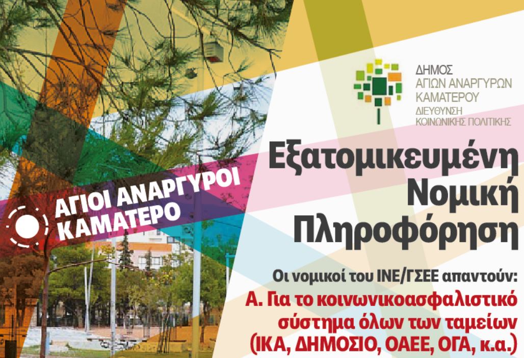 Η υπηρεσία αυτή του Δήμου Αγίων Αναργύρων – Καματερού υλοποιείται στο πλαίσιο της συνεργασίας του με το ΙΝΕ – ΓΣΕΕ για την από κοινού ανάπτυξη κοινωνικών δράσεων και τη δημιουργία υπηρεσιών στο πλαίσιο του έργου που υλοποιεί το Ινστιτούτο, με τίτλο: «Εξ αποστάσεως και δια ζώσης υπηρεσίες Πληροφόρησης και Συμβουλευτικής Υποστήριξης και Ενδυνάμωσης Εργαζομένων και Ανέργων».