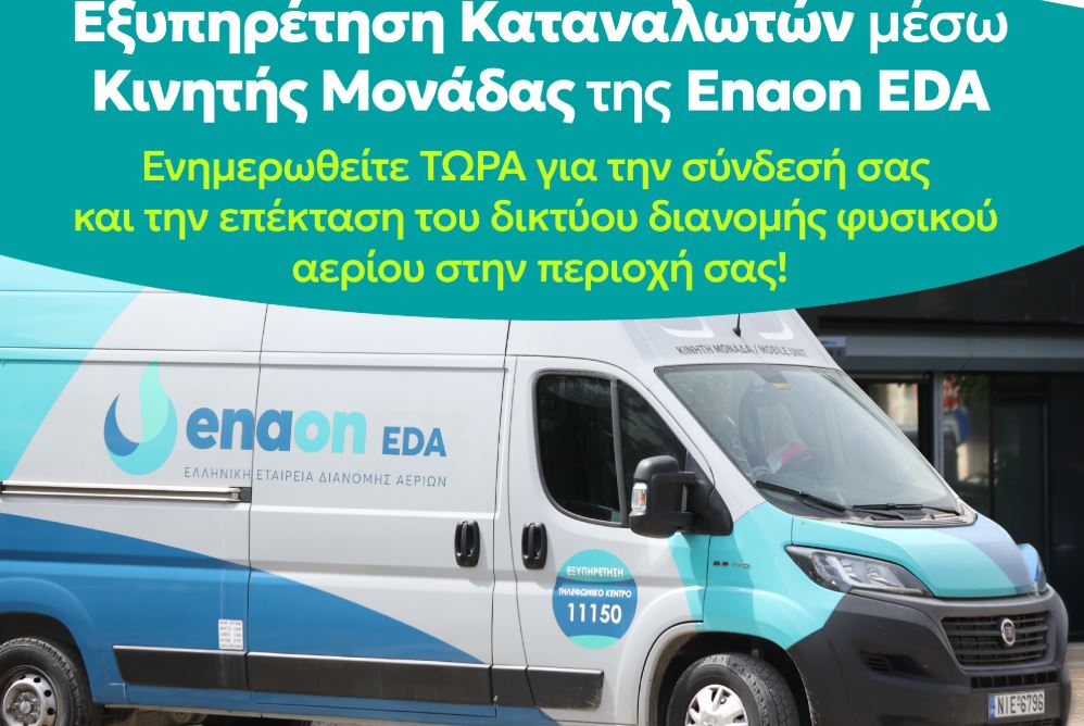 Η EnaonEDA, Ελληνική Εταιρεία Διανομής Αερίων, θυγατρική τηςEnaon, ανακοινώνει ότι η κινητή μονάδα εξυπηρέτησης καταναλωτών θα βρίσκεται στον Δήμο Αγίων Αναργύρων Καματερού,για την εξυπηρέτηση των κατοίκων που ενδιαφέρονται να συνδεθούν με το δίκτυο διανομής φυσικού αερίου.