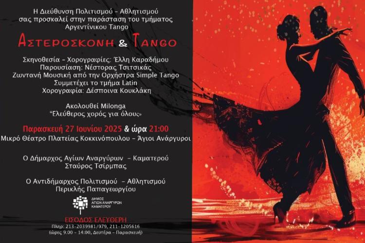 Η Διεύθυνση Πολιτισμού – Αθλητισμού σας προσκαλεί στην παράσταση του τμήματος Αργεντίνικου Tango