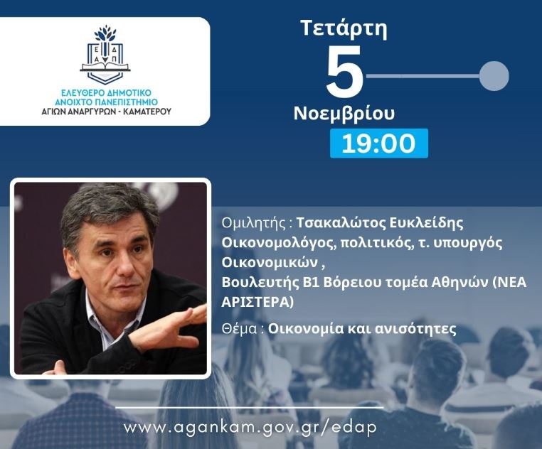 Σας ενημερώνουμε ότι η επόμενη συνεδρία του Ελεύθερου Δημοτικού Ανοικτού Πανεπιστημίου Αγίων Αναργύρων-Καματερού (ΕΔΑΠ) θα πραγματοποιηθεί την Τετάρτη 5 Νοεμβρίου 2025 και ώρα 19.00 στο 1ο Δημοτικό Σχολείο Αγίων Αναργύρων.