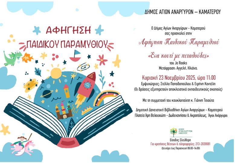 Την Κυριακή 23 Νοεμβρίου 2025 και ώρα 11.00 θα πραγματοποιηθεί αφήγηση παιδικού παραμυθιού «ένα κουτί με πεταλούδες» στη Δημοτική Βιβλιοθήκη στην πλατεία Άρη Βελουχιώτη.