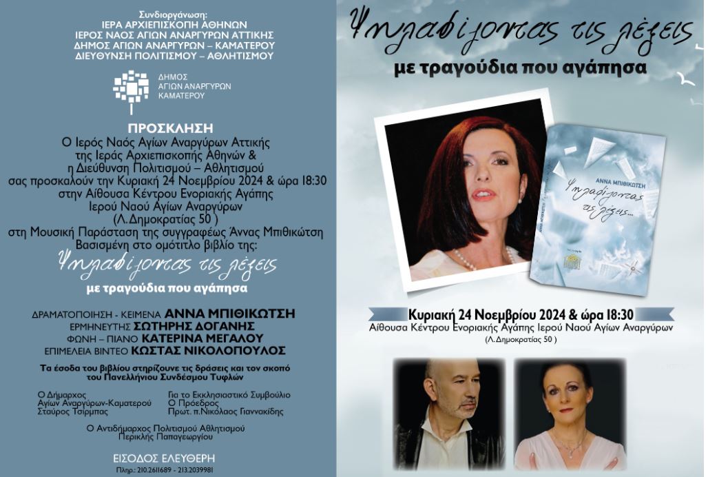 Την Κυριακή 24 Νοεμβρίου και ώρα 18.30 θα πραγματοποιηθεί μουσική παράσταση της κ. Άννας Μπιθικώτση στην Αίθουσα του Κέντρου Ενοριακής Αγάπης του Ιερού Ναού Αγίων Αναργύρων βασισμένη στο ομίτιτλο βιβλίο της «Ψηλαφίζοντας τις λέξεις με τραγούδια που αγάπησα».