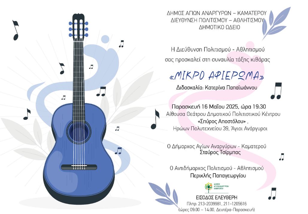 Άγιοι Ανάργυροι:Ρεσιτάλ κιθάρας την Παρασκευή 16 Μαΐου 2025 15 Μάιος, 2025 By agioianargyroinews Συναυλία τάξης κιθάρας στο Δημοτικό πολιτιστικό κέντρο. Πολιτιστικά Ιστολόγιο του χρήστη agioianargyroinews Συντάκτης agioianargyroinews