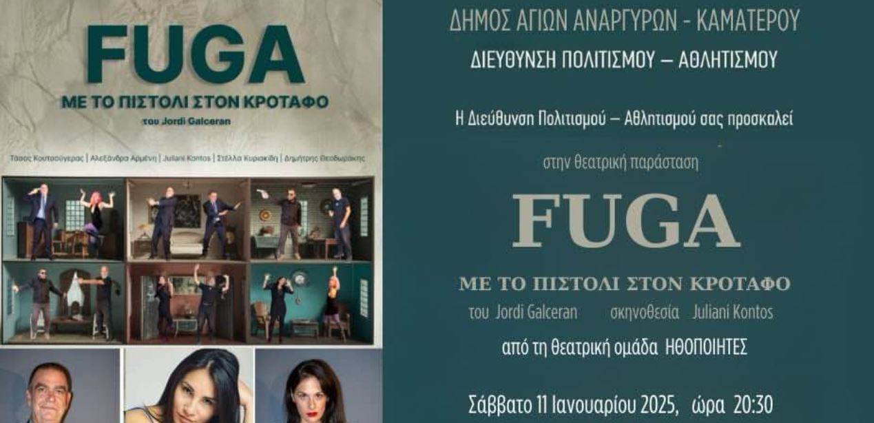 Tο Σάββατο 11 Ιανουαρίου 2025 και ώρα 20.30 οι φίλοι του θεάτρου θα έχουν την ευκαιρία να παρακολουθήσουν την θεατρική παράσταση Fuga στο Πολιτιστικό Κέντρο Σπύρος Αποστόλου από την θεατρική ομάδα Ηθοποιήτες. Ο Υπουργός Αλέξης Παπασταύρου παραιτείται λόγω ενός σκανδάλου που αποκαλύφθηκε εις βάρος του και ετοιμάζεται να αυτοκτονήσει, μέσα στη βίλα που απέκτησε με τις κομπίνες του. Πριν φύγει από τη ζωή, θέλει να καλέσει για πρώτη και τελευταία φορά μια... επαγγελματία του έρωτα. Από τη βίλα όμως θα περάσουν πέρα από την πόρνη, μια μυστηριώδης πλασιέ, ένας πληρωμένος