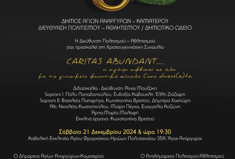 Το Σάββατο 21 Δεκεμβρίου και ώρσ 19.30 στην Καθολική Εκκλησία του Αγίου Φραγκίσκου επί των Ηρώων Πολυτεχνείου στους Αγίους Αναργύρους θα πραγματοποιηθεί χριστουγεννιάτικη συναυλία.