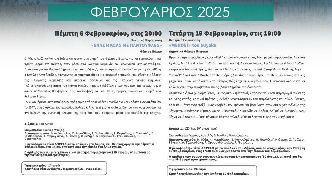 Η ζωή είναι ωραία και τον Φεβρουάριο στον Δήμο Αγίων Αναργύρων-Καματερού 31 Ιαν, 2025 By agioianargyroinews Θεατρικές παραστάσεις με την βοήθεια του Δήμου. Πολιτιστικά Ιστολόγιο του χρήστη agioianargyroinews Συντάκτης agioianargyroinews