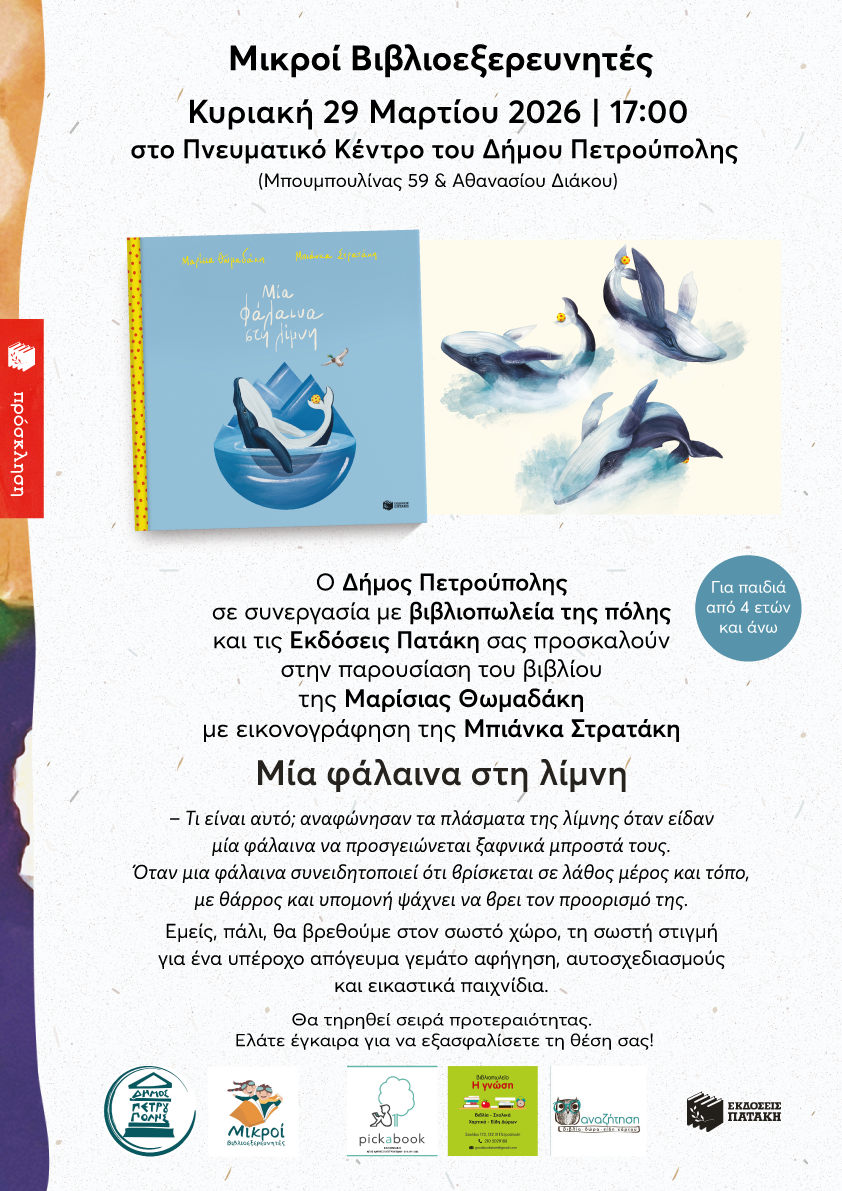 Την Κυριακή (29/3, 17:00), στο Πνευματικό Κέντρο του Δήμου Πετρούπολης (Μπουμπουλίνας 59 & Αθ. Διάκου) -στο πλαίσιο της δράσης, με τίτλο: «Μικροί Βιβλιοεξερευνητές»- ο Δήμος Πετρούπολης προσκαλεί τα παιδιά, 5 ετών και άνω, στη διαδραστική παρουσίαση του βιβλίου, «Μια φάλαινα στη λίμνη».