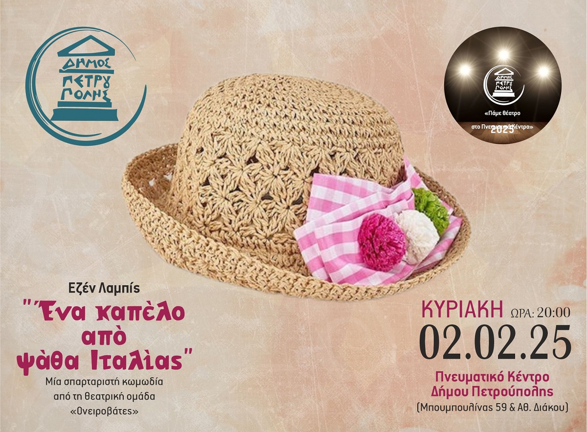 Ο Δήμος Πετρούπολης θα φιλοξενήσει την ερχόμενη Κυριακή (2/2, 20:00), στη σκηνή του Πνευματικού Κέντρου (Μπουμπουλίνας 59 & Αθ. Διάκου), τη θεατρική ομάδα «Ονειροβάτες», η οποία θα παρουσιάσει το έργο του Εζέν Λαμπίς, «Ένα καπέλο από ψάθα Ιταλίας».