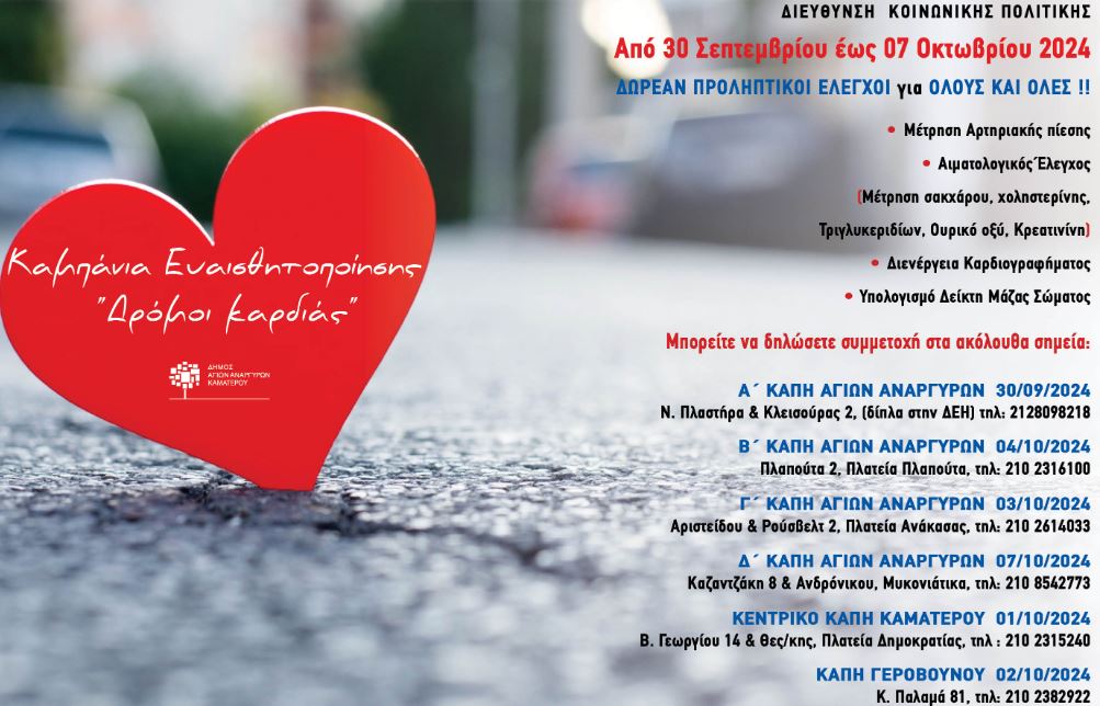 Ο Δήμος ενημερώνει τους δημότες ότι από 30 Σεπτεμβρίου έως και 7 Οκτωβρίου θα πραγματοποιηθούν δωρεάν διαγνωστικές εξετάσεις